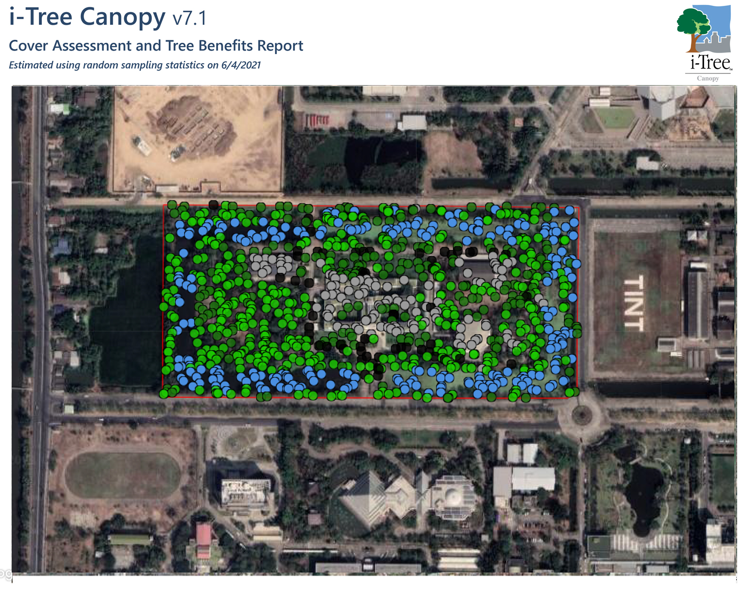 ฐานข้อมูลสัดส่วนและองค์ประกอบของพื้นที่สีเขียวในเมืองขนาดใหญ่ จากภาพถ่ายทางอากาศหรือภาพถ่ายดาวเทียม โดยใช้ซอฟแวร์ i-Tree Canopy ประกอบด้วย ตาราง, กราฟแท่ง และแผนภูมิวงกลม (ค่าเฉลี่ย) โดยแบ่งสัดส่วนและองค์ประกอบของพื้นที่สีเขียวในเมืองขนาดใหญ่ ได้ 5 สัดส่วน ดังนี้