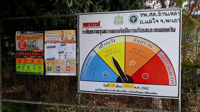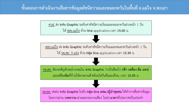 เพื่อให้ง่ายต่อการทำความเข้าใจของประชาชน การพัฒนากลไกการสื่อสารข้อมูลระบบเตือนภัยฯ ด้วยการนำข้อมูลที่ได้จากระบบเตือนภัยฯ แปลงเป็นข้อมูลข่าวสารการเตือนภัยในระดับชุมชนผ่านรูปแบบสื่อการเรียนรู้อย่างง่ายประกอบด้วย (1) แผ่นป้ายพยากรณ์สถานการณ์ความร้อนและหมอกควันล่วงหน้า 1 วัน (2) Info graphic ข้อมูลค่าดัชนีความร้อนและปริมาณหมอกควัน ระดับผลกระทบต่อสุขภาพ และข้อแนะนำในการปฏิบัติตัวในช่วงที่เกิดสถานการณ์ความร้อนและหมอกควัน (3) บทความ/ วิทยุ ประกาศแจ้งเตือนและสื่อสารข้อมูลสู่ประชาชนในพื้นที่ และ (4) เอกสารที่เกี่ยวข้องกับความร้อนและหมอกควัน ซึ่งกระบวนการทำงานที่สำคัญที่สุด คือ ขั้นตอนการประชุมปรึกษาหารือร่วมกับเจ้าหน้าที่ของสำนักงานสาธารณสุขอำเภอแม่ใจ และโรงพยาบาลส่งเสริมสุขภาพตำบลถึงแนวทาง/ วิธีการ และขั้นตอนการสื่อสารข้อมูลในพื้นที่ภายใต้การมีส่วนร่วมในการขับเคลื่อนและดำเนินงานไปด้วยกัน